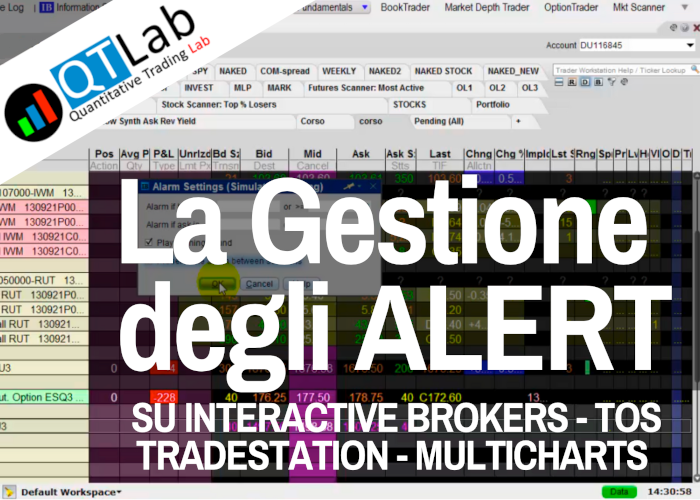 Le piattaforme utilizzate sono Tradestation, Interactive Brokers e Think Or Swim: ognuna presenta delle specificità che le rendono interessanti nell’impostazione di questi specifici Alert, e soprattutto permettono di attivare Alert ridondanti (quindi lo stesso tipo di alert su due piattaforme) per essere certo di essere avvisato anche qualora una delle piattaforme stesse sperimentando qualche problema (connettività o simile).